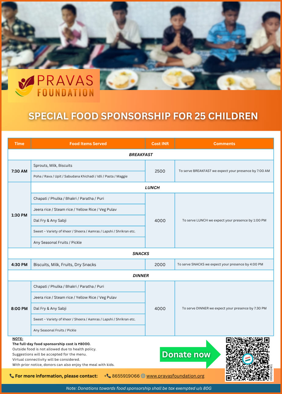 Account Name: - PRAVAS FOUNDATION Bank Name: - State Bank of India Account Number: - 38199696019 Branch: - Kandivali (East), Mumbai IFSC Code: - SBIN0010899 Account Mode- Current